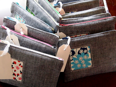 I made 13 pouches, all of the same simple design. They are made out of what I thought was a grey crossweave (in reality it's more blue) and a single patterned fabric for the reverse applique window and lining. Everything came from my stash, including the interfacing and zippers. They sewed up quickly once I got an assembly line going.